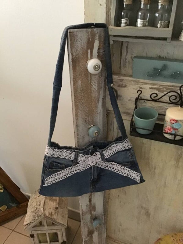 Sac en jean,dentelle blanche